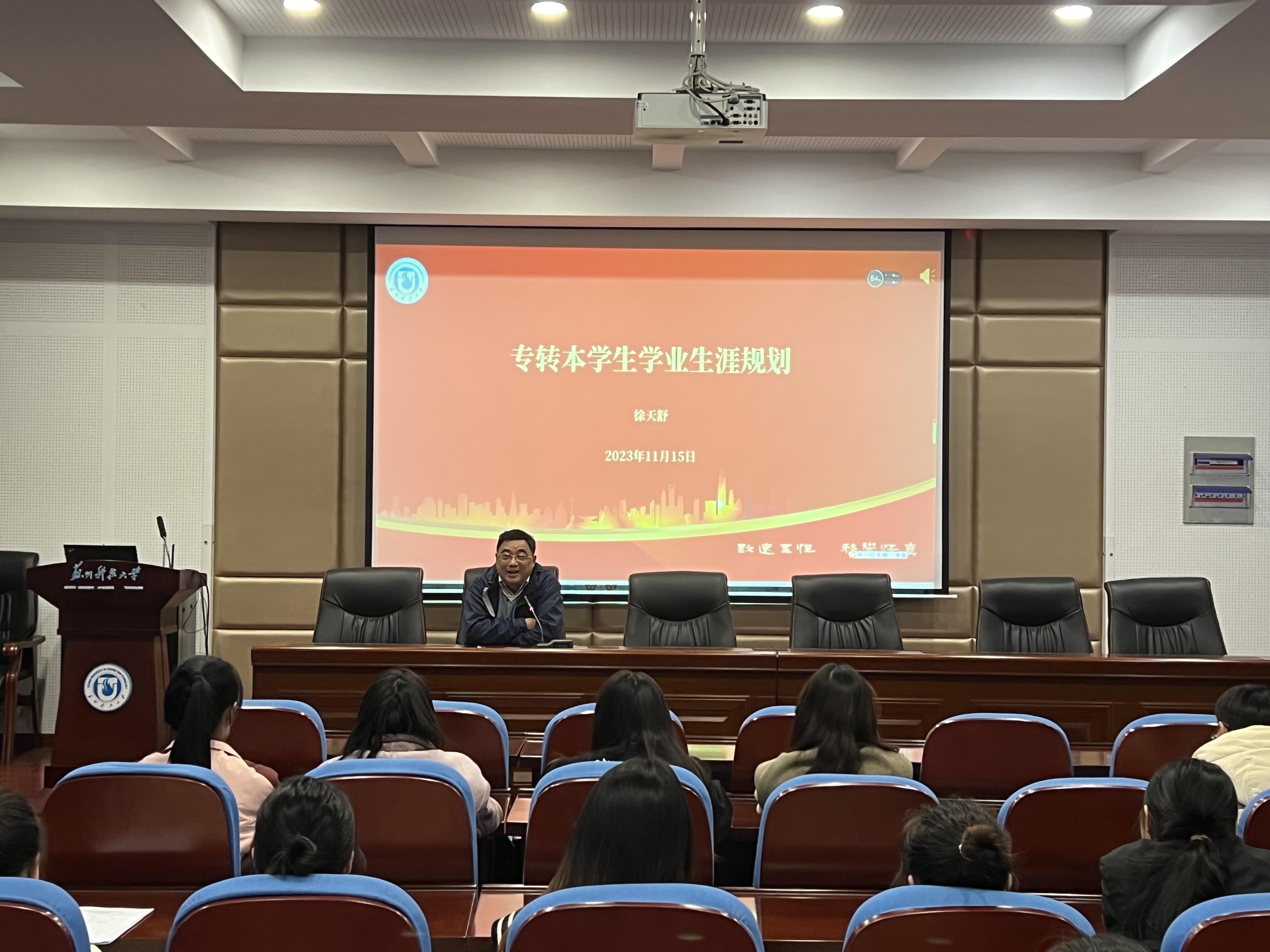 11月15日下午,太阳成集团tyc33455cc举办2021级专转本新生学业规划讲座,讲座由硕士生导师、校城市发展智库研究员、校学术委员会委员、工商管理专转本2111班班主任徐天舒教授主讲,2021级工商管理专转本全体员工参加。