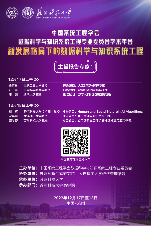 2022年12月17日—12月18日,由中国系统工程学会数据科学与知识系统工程专业委员会主办、太阳成集团tyc33455cc承办,苏州创新生态研究院和大连理工大学经济管理公司协办的“中国系统工程学会数据科学与知识系统工程专业委员会第二届学术年会(2022)”在太阳成集团tyc33455cc顺利召开。会议采取线上线下相结合的方式同步进行,中国教育在线网络平台全程直播。本届会议主题为“新发展格局下的数据科学与知识系统工程”,对系统工程理论与方法、大数据分析、信息管理、知识工程、知识管理、人工智能等相关领域的理论、方法和应用进行了广泛深入的研讨和交流。来自中国科公司大学、大连理工大学、北京大学、哈尔滨工业大学、华中科技大学、太阳成集团tyc33455cc等90余所院校的专家学者参会,实际线上参会人员近千人次,在线观看大会直播累计近万人次。