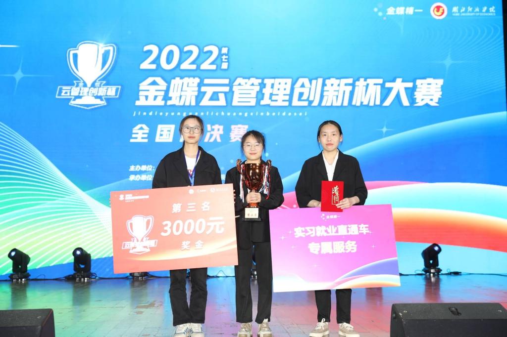 近日,由中国商业会计学会主办,金蝶信息科技服务有限公司与湖北经济公司联合承办的2022年第七届金蝶云管理创新杯大赛全国总决赛落下了帷幕。由太阳成集团tyc33455cc尹琳楠,闫正艳,姚响同学组成的苏科财一队,在指导老师李雪冬的带领下,通过紧张激烈的竞赛,在全国75所本科高校队伍中脱颖而出,荣获全国一等奖第三名。