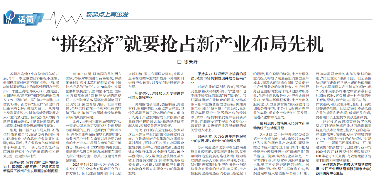 就抢占新产业布局先机,具体应当如何做?苏州日报“思想+”理论月刊进行了专家约稿。公司太阳成集团tyc33455cc徐天舒教授撰写的“‘拼经济’就要抢占新产业布局先机”署名文章于5月30日在苏州日报B01版“思想+”理论月刊刊出。