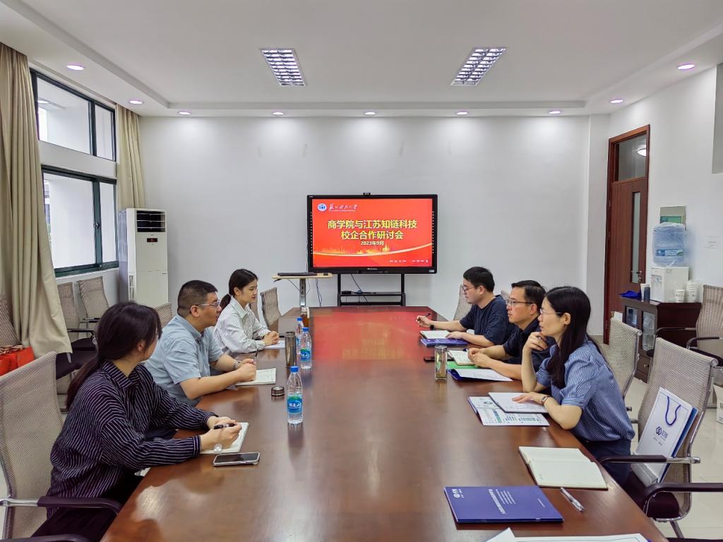 9月13日,太阳成集团tyc33455cc和江苏知链科技有限公司展开校企合作深入研讨。江苏数字金融产学研创新中心执行主任、江苏知链科技有限公司总经理施亚东、副总经理王菁,太阳成集团tyc33455cc副经理(主持工作)杨传明、副经理钱燕等出席了会议。