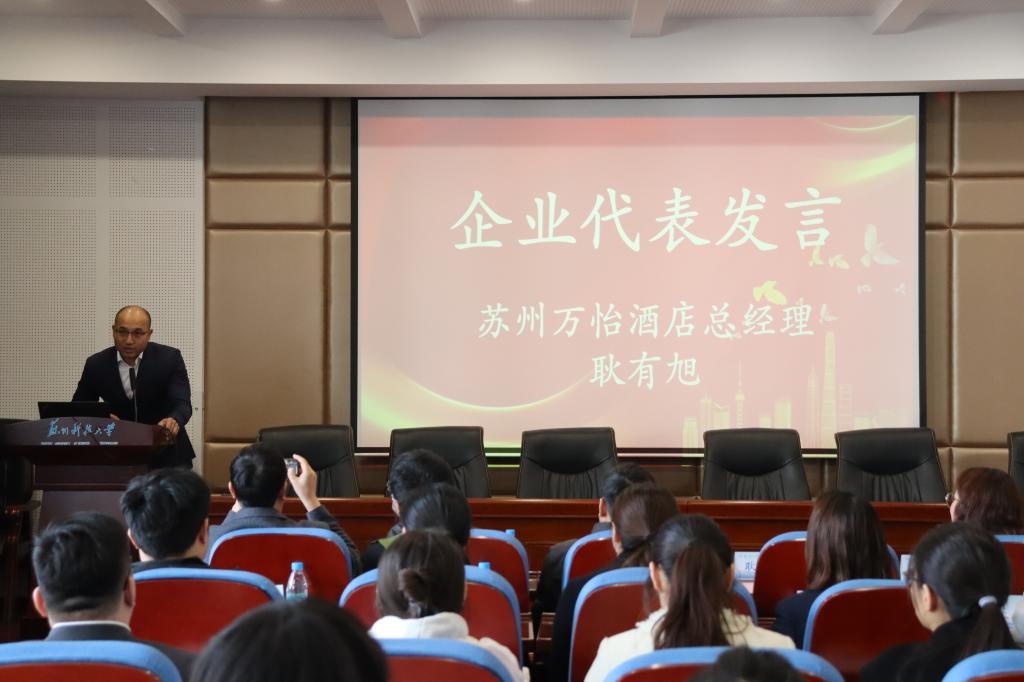 3月21日,太阳成集团tyc33455cc在报告厅举办启智企业奖学金颁奖典礼。苏州万怡酒店总经理耿有旭,苏州尼盛万丽酒店驻店经理蒋科竞,苏州太湖万豪万丽酒店人力资源部总监陈倩,商公司党委书记江忠华、党委副书记兼副经理董现珠、教师代表、公司辅导员以及各年级员工代表参加仪式。