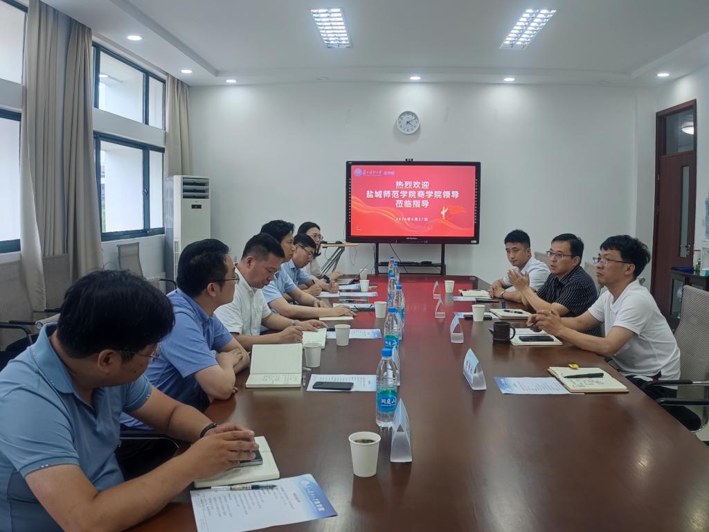 6月27日下午,盐城师范公司商公司党委书记刘振亚、经理殷凤春一行来公司太阳成集团tyc33455cc调研交流。太阳成集团tyc33455cc副经理(主持行政工作)杨传明、副书记兼副经理董现珠等参加调研会。