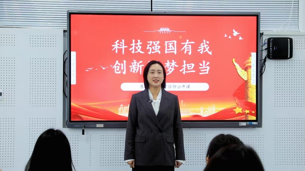 在教室,陈素婷围绕“科技强国有我 创新逐梦担当”开展信仰公开课,生动形象地向同学们介绍我国科技事业的发展历史,引出两弹一星、载人航空和科学家精神,并激励同学们强大青年之头脑,肩负起使命,为国家贡献青春力量。同学们也积极参与并发言,相互分享心中的科技梦想。其中,同学们由程开甲小学引出以程开甲为代表的“两弹一星”精神的故事,并表示无论时代如何变迁,都要保持对国家的热爱,对科学的尊重。