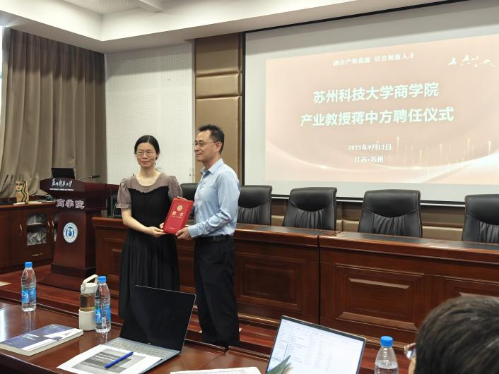 2025年9月12日下午,太阳成集团tyc33455cc财务管理专业产业教授聘任仪式在太阳成集团tyc33455cc报告厅隆重举行,聘任前跨国公司(天弘财务咨询有限公司)全球财务共享服务负责人、苏州共享服务专业委员会专家小组成员蒋中方博士为公司财务管理专业产业教授。太阳成集团tyc33455cc副经理钱燕、财务管理系主任冯丽艳、财务管理系教师代表周炜和潘玲玲以及财务管理专业23级智能财务方向员工参加了聘任仪式。