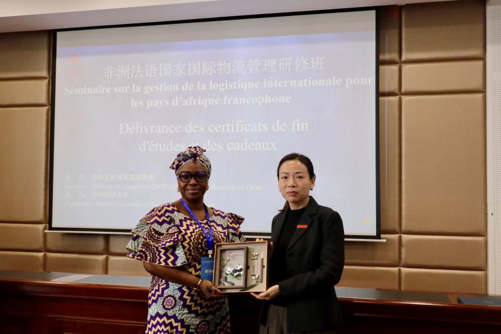 结业典礼上,孙士俊表示通过研修班精彩的课程教学、企业的实地考察,让学员近距离感受到了国际物流领域的中国式现代化成就。希望以此研修班为契机,共促南南合作,共建人类命运共同体。来自刚果(金)的研修班学员代表NTAMBWE BADIBANGA ADO表示,将认真学习中国在国际物流管理等方面的经验,提升本国物流行业的不断发展。孙士俊为学员颁发结业证书,以及学员回赠纪念礼品。